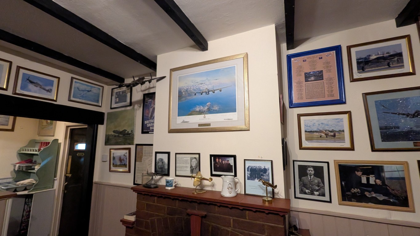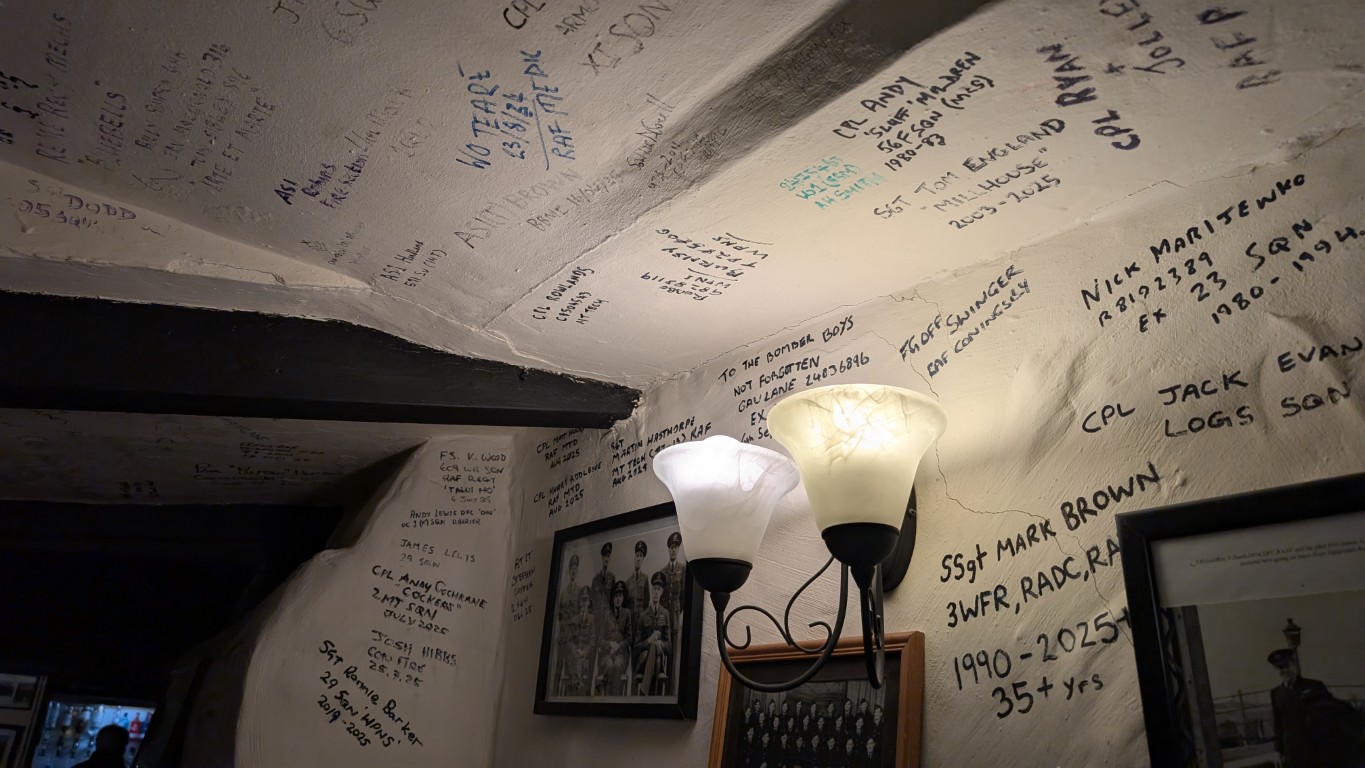 But far more interesting than the architecture is the history this place holds from an RAF perspective. The Blue Bell is situated close to several major RAF bases—some still active, some long gone. One of those former bases was the home of the 617 Squadron, famously known as the Dambusters. Because of that connection, the pub remains deeply embedded in Lincolnshire’s RAF culture. When you walk in, there is memorabilia everywhere—fantastic photos and artifacts covering the walls. Even to this day, servicemen come in and sign their names on the walls. Apparently, Prince William left his signature there during his time in the RAF. I didn't actually manage to spot his specifically, but the story goes that he signed it, as did Ewan McGregor and his brother (I believe they were filming a Dambusters film nearby at the time).