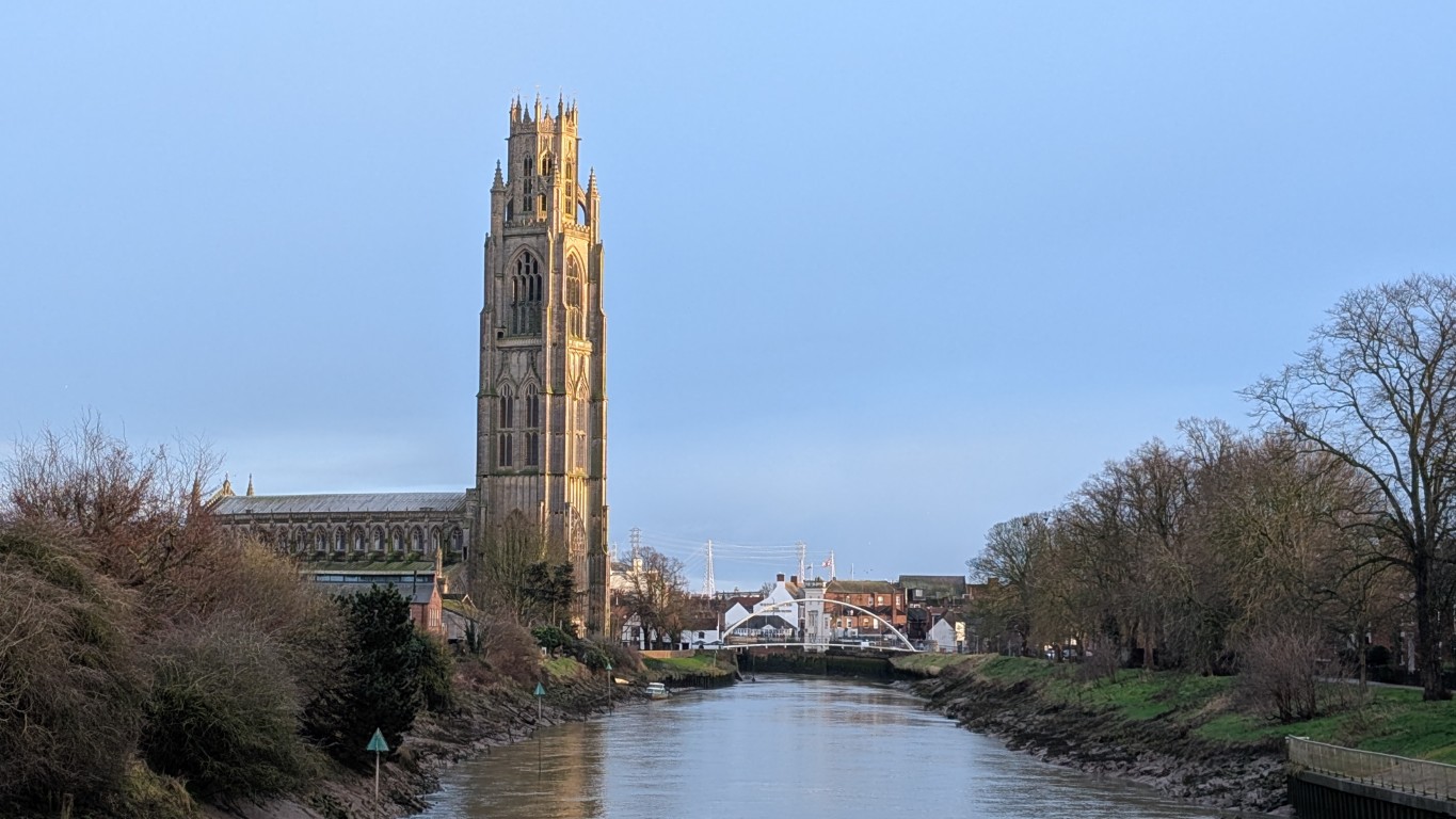 Summary (by AI): While I found the social tension and run-down state of Boston's industrial area unsettling, my visit to the River Witham was redeemed by the magnificent sight of the Boston Stump glowing in the evening light.