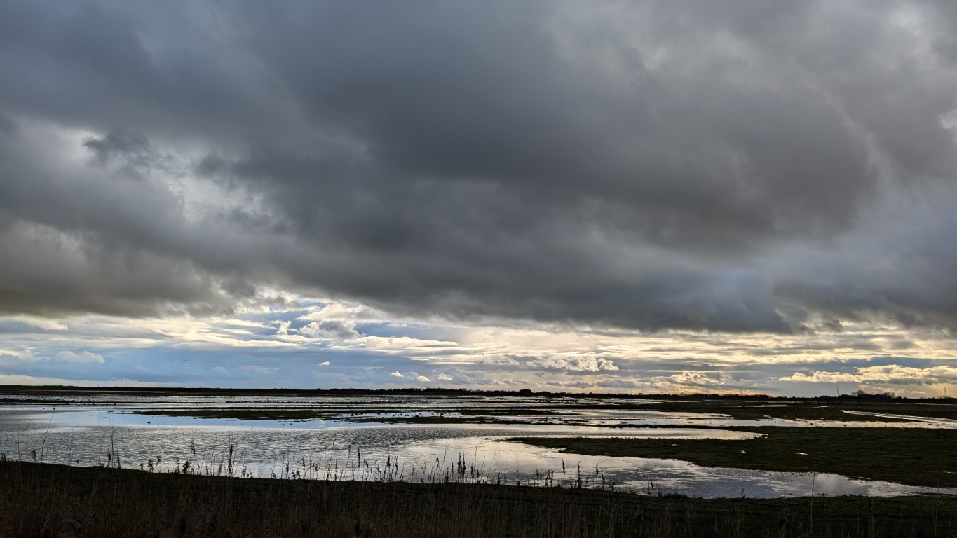 I started my walk through the reserve, which has been reclaimed from a lovely natural area of the estuary. It’s clearly well-managed—you can see where tractors have been out building ridges and shaping the land—but it still feels wonderfully wild. It had been a horribly grey day, but just as I arrived, the afternoon sun began scraping through the clouds, opening up some incredible views.